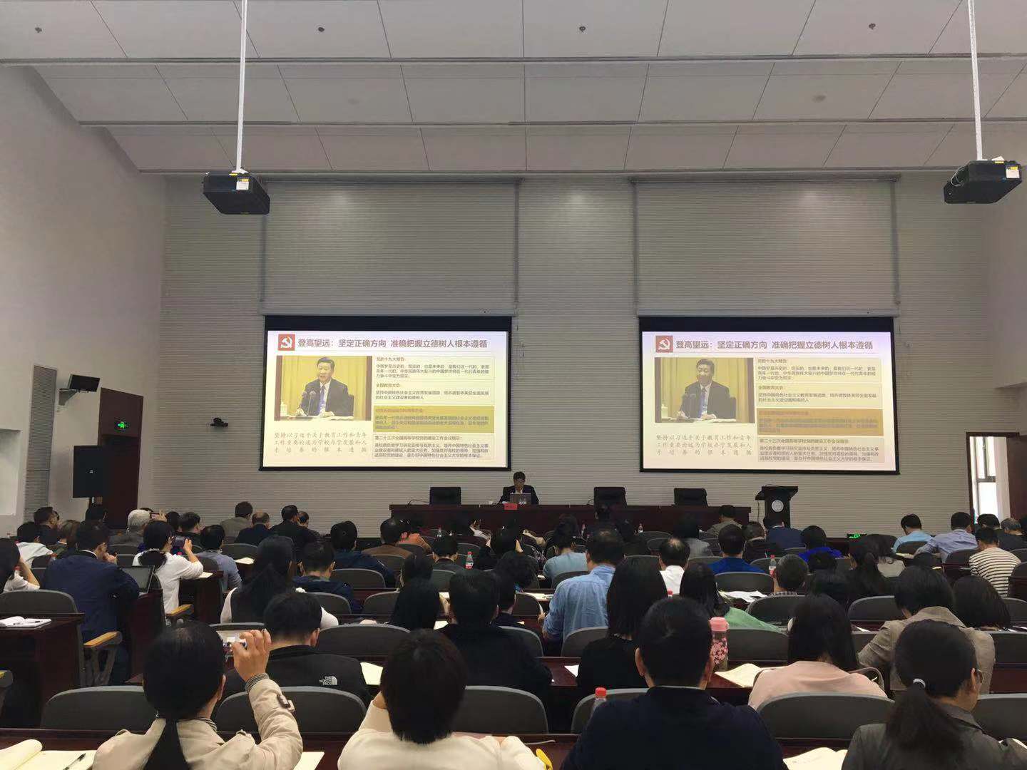 按照学校“不忘初心、牢记使命”主题教育总体安排,学校领导班子成员要在学习教育和调查研究的基础上讲好专题党课。11月6日,校党委书记胡征宇以“深入学习宣传贯彻党的十九届四中全会精神,登高望远脚踏实地推动学校党建和事业高质量发展”为题,带头讲授“不忘初心、牢记使命”主题教育专题党课。全体在校校领导、科级以上干部、全体辅导员、支部书记和两课教师200余人一起听课。