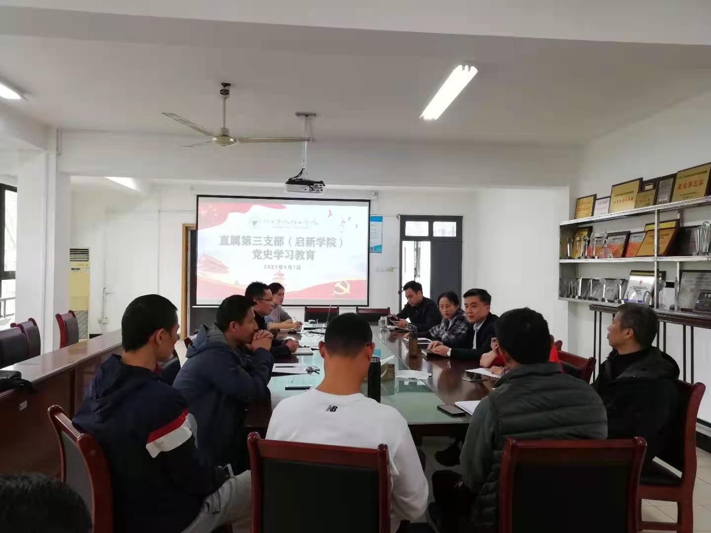 4月1日中午,直属第三党支部在游泳馆201召开党史学习教育专题会议,启新学院全体教师党员参加了会议。会议由直属第三党支部书记董小燕主持。