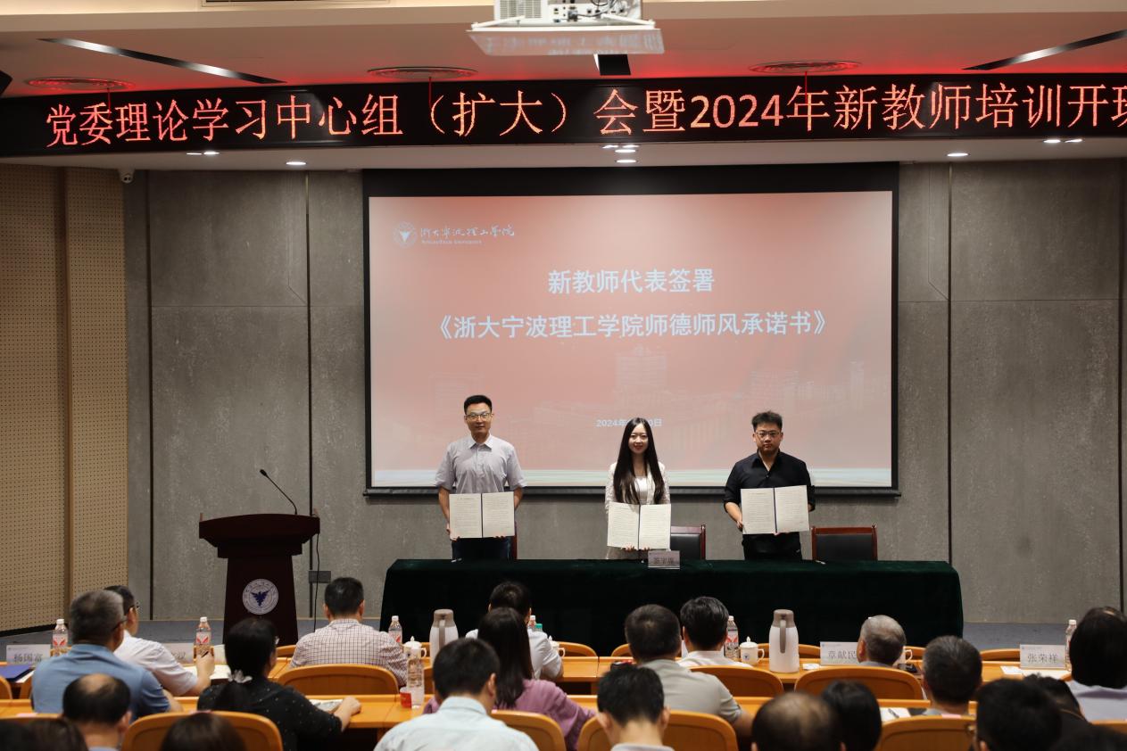 开班仪式上,赛霆博士代表新教师作主题发言,陈恒、童银辉、张秒秒作为新教师代表签署《浙大宁波理工学院师德师风承诺书》。
