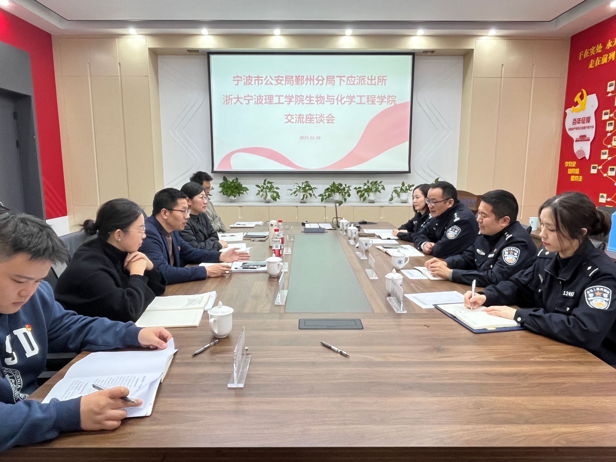 为深化党建引领基层治理,筑牢校园安全防线,12月10日,生物与化学工程学院与下应派出所联合开展党建联建活动,围绕学生防诈防骗工作实务与党建共建长效机制展开深入交流研讨。学院党委书记刘哲、党委副书记芦美丽、下应派出所教导员华奎、副所长龚海岳和部分教师党员代表、民警代表参加活动。